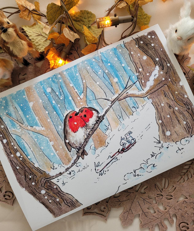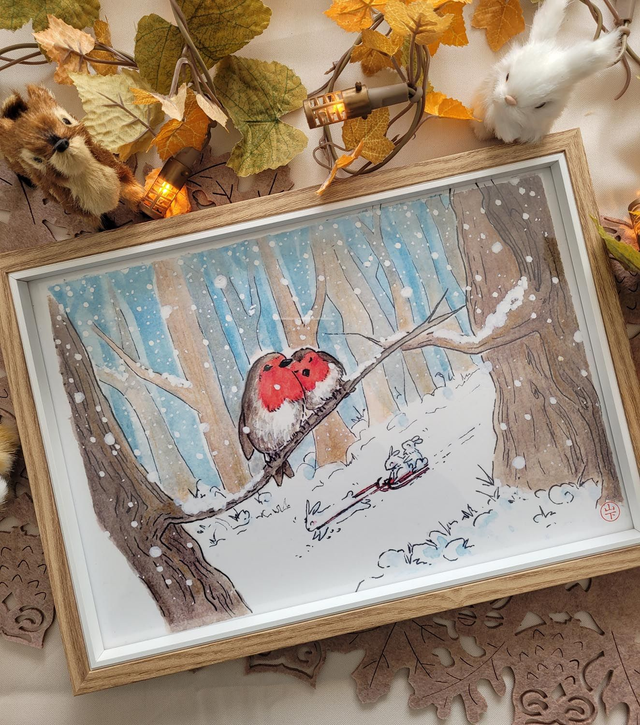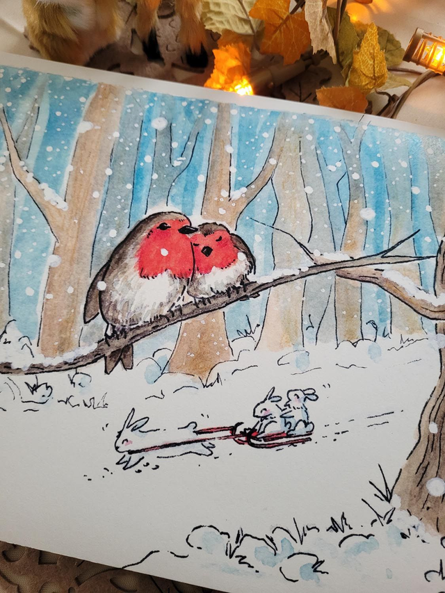 Tendrement enlacé, un couple de rouge-gorges profite d'une jolie matinée enneigée. Là-haut dans les branches le calme et la sérénité règnent sur les sommets de la forêt. Un peu plus bas sur le sentier, trois lapins enjoués se jettent sur cette piste enneigée. Cris, rires et glissades viennent troubler la paix de la forêt.